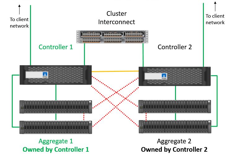 In our example below, Controller 1 and Controller 2 are High Availability peers for each other. Aggregate 1 is owned by Controller 1 and Aggregate 2 is owned by Controller 2. If you give clients connectivity to Logical Interfaces on both controllers, then they can access either aggregate through either controller. Traffic will go over the cluster interconnect if a client connects to an interface on a controller which does not own the aggregate.
