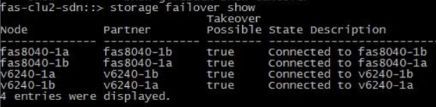 We have a four node cluster in the example output below. The first two nodes are our first HA pair and the second two nodes are our second HA pair. 'Takeover possible true' for all of them tells us that our High Availability configuration is good.