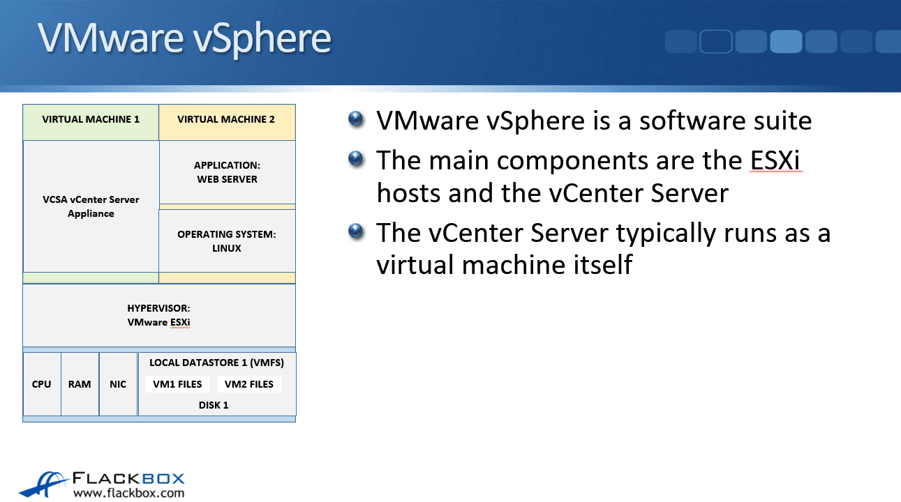 The software that is going to be installed is ESXi. It is going to be installed onto your physical servers, and you’re also going to install the software of the vCenter server as a virtual machine. However, you can’t install VMware vSphere.