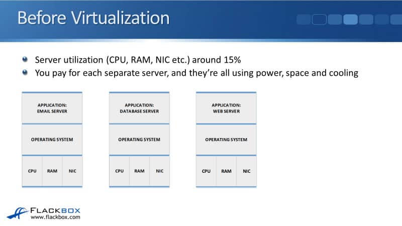 If you looked at the utilization on those servers, meaning how busy the CPU, the RAM, and the network card were, they’d be running at about 15% utilization. There are actually loads of spare performance capacity left on those servers. So it’s not efficient that you’re paying for three separate physical servers, but they’re each running at only 15% of their possible performance.