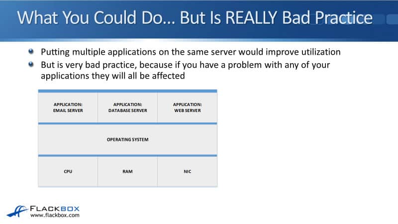 Then, I could run my email server, database server, and web server applications all on that same server. However, putting multiple applications on the same server is a terrible practice because if you have a problem with any of those applications, they’re all going to be affected.