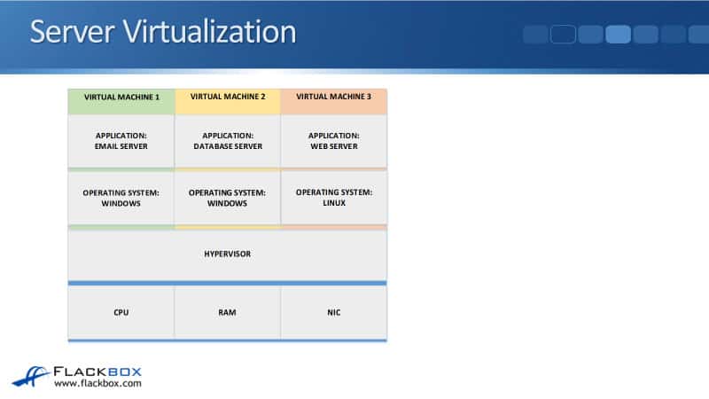 You can see that each separate virtual machine is a separate instance. Each got its own Operating System. So if we have a problem with the email server and that crashes its underlying Windows Operating System, it’s only going to crash Virtual Machine 1. Virtual Machine 2 and Virtual Machine 3 will keep running just fine.