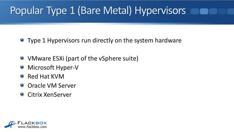 Some examples of popular type one hypervisors are VMware ESXi, the software installed onto the hardware, and VMware ESXi is part of the vSphere suite. Other popular type 1 hypervisors are Microsoft Hyper-V, Red Hat KVM, Oracle VM Server, and Citrix XenServer.