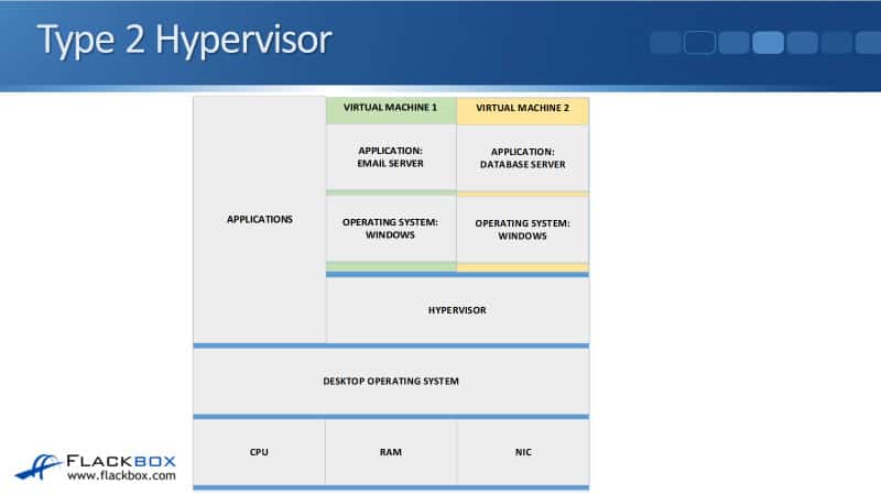 Rather than installing a hypervisor directly onto the hardware, with a type 2 hypervisor, we’re running a normal desktop Operating System on here. So this would be Windows 10, for example, running on here. On top of there, we’ve got our normal applications.