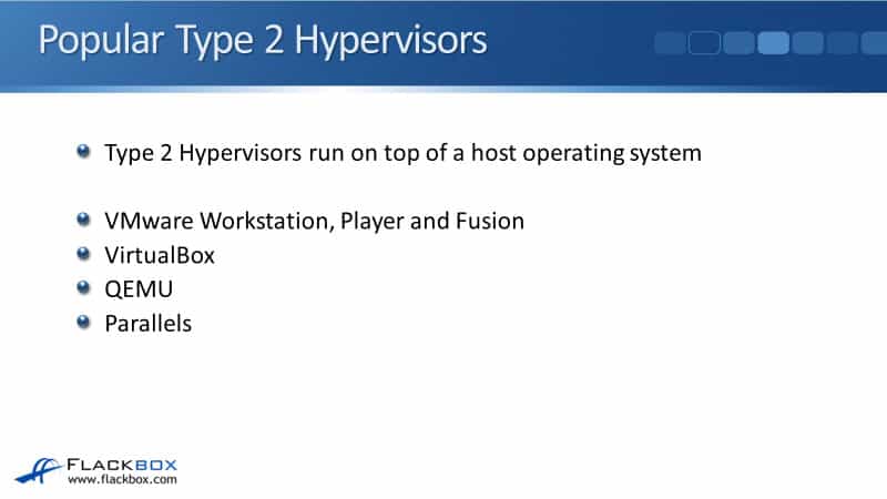 Some examples of popular type 2 hypervisors are VMware Workstation, VMware Player, and VMware Fusion, which is used on Mac, VirtualBox, QEMU, and Parallels.