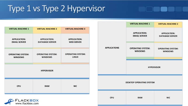 A type 1 hypervisor is installed directly on top of the hardware, and you have the virtual machines on there. With a type 2 hypervisor, you’ve got your normal desktop Operating System like Windows 10 and the hypervisor is installed on top of there.
