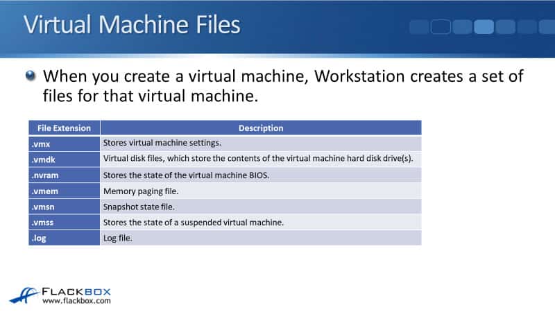 When you create a virtual machine, the hypervisor software creates a set of files for that virtual machine, and I’m talking about VMware here. So these are the files that are created when you create a virtual machine in VMware.