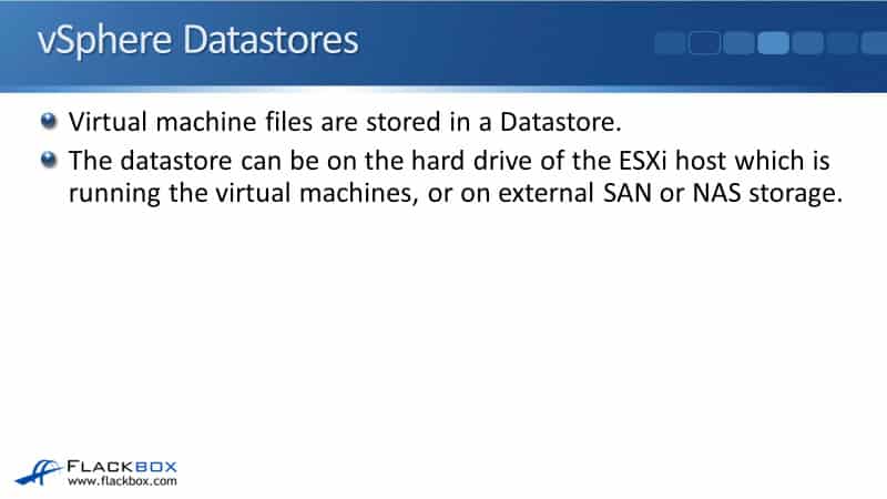 Each virtual machine’s folder is going to have its virtual machine files. The datastore can be on the hard drive of the ESXi host, which is running the virtual machines, or it can be on external SAN or NAS storage.