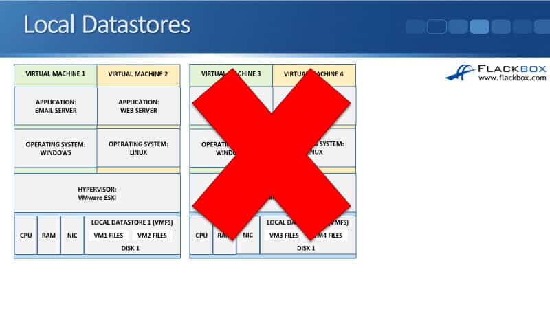 Now, in an enterprise environment, you’re not going just to have one ESXi host. You’re going to have multiple hosts. So you can see here that we’ve got Host 1, which is running Virtual Machines 1 and 2, and it’s got the files for Virtual Machines 1 and 2 in its local datastore.