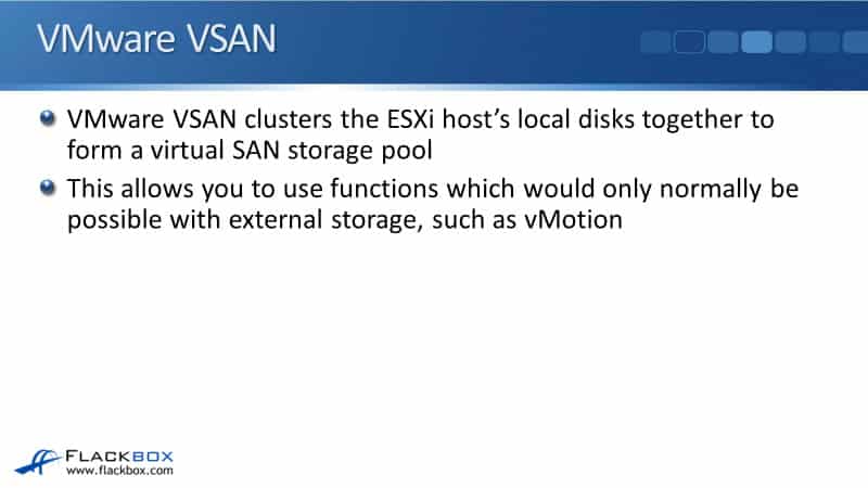 VMware VSAN clusters the ESXi host’s local disks together to form a virtual SAN storage pool. You can get those functions, such as vMotion, without actually having external SAN or NAS storage. Just with your ESXi hosts and using their local disks, you can cluster them together to form a virtual SAN, and your virtual machine files will be saved there.