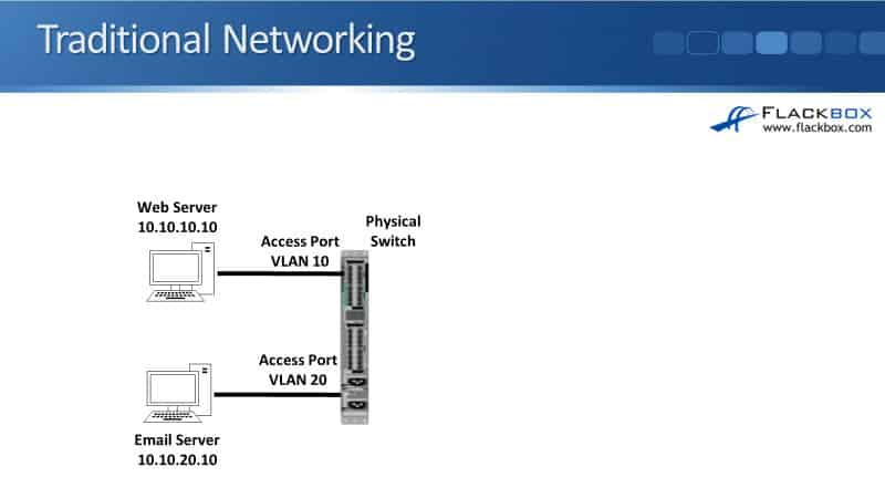 The last thing to tell you about is how the networking works in VMware. Looking at traditional networking first, you can see here that I’ve got a web server and an email server. This is with the old traditional way of doing it, where these are running on separate physical boxes.