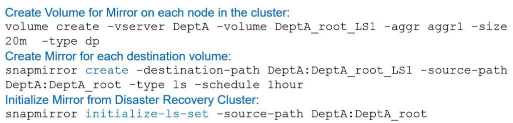 The “volume create” and the “snapmirror create” commands must be run for every single destination volume. It’s recommended you do this for each node. As an example, if we had a 4-node cluster, our volumes would be depta_root_LS1 on node 1, LS2 on node 2, etc.