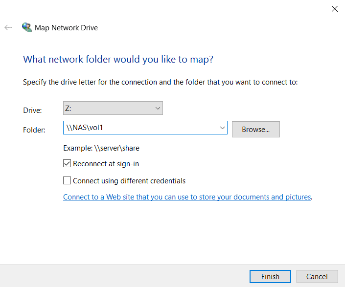 3. Log in to the WinA host as administrator and map a network drive to the vol1 share.