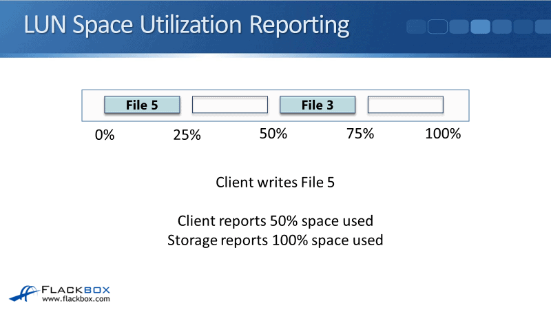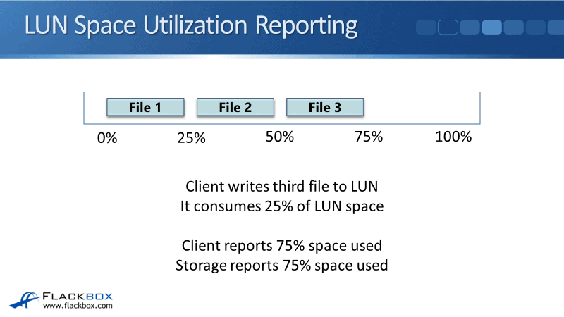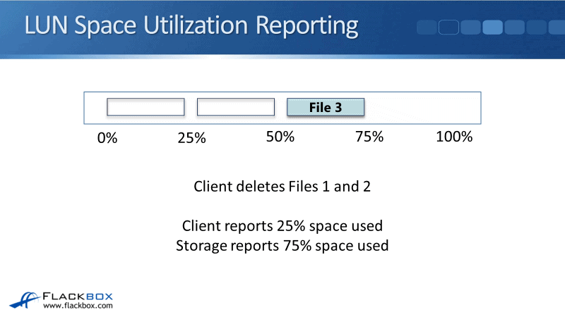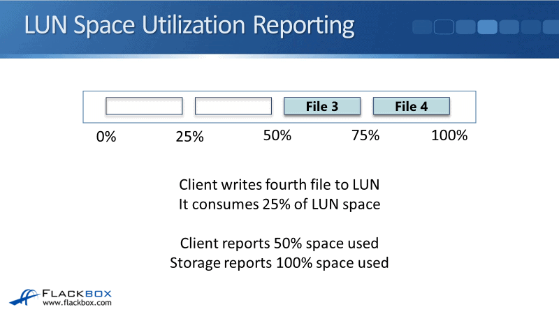 In the figure below, the big box is a LUN. For example, the client writes two files to the LUN, File 1 and File 2. Each consumes 25% of the LUN space. The client will report 50% space used in the LUN and the storage will also report 50% space used. The client has written blocks to the LUN which take up 50% of the size.