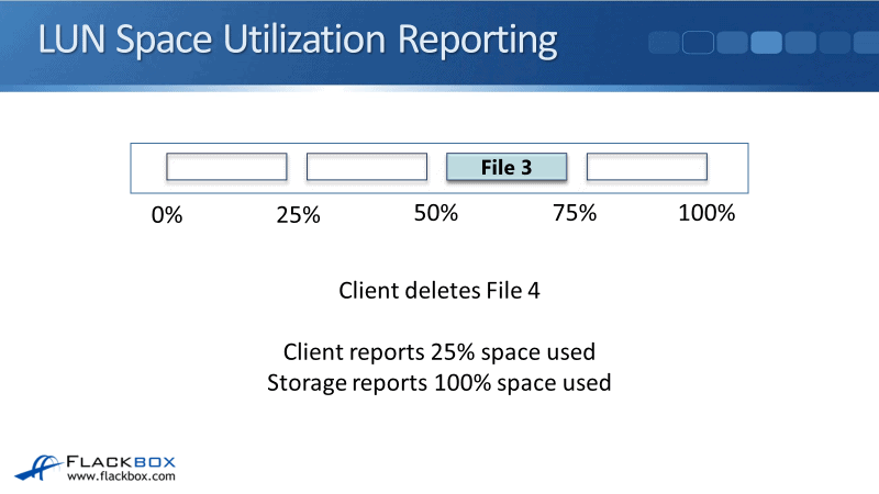 If the client deletes File 4, the client reports 25% space used. Again, the storage system doesn't know about this happening, so the storage still reports 100% space used. Once the client has written data that is equivalent to 100% of the LUN, the storage system always sees the LUN as being 100% full.