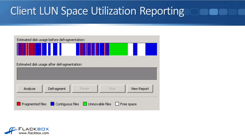 If we looked at an actual storage utilization tool on the client, the disc defragmentation tool on a Windows client for example, you can see that it can see the files that are taking up contiguous space. It includes fragmented files, unmovable files, and free space. The storage system does not have this kind of visibility into the file systems though.