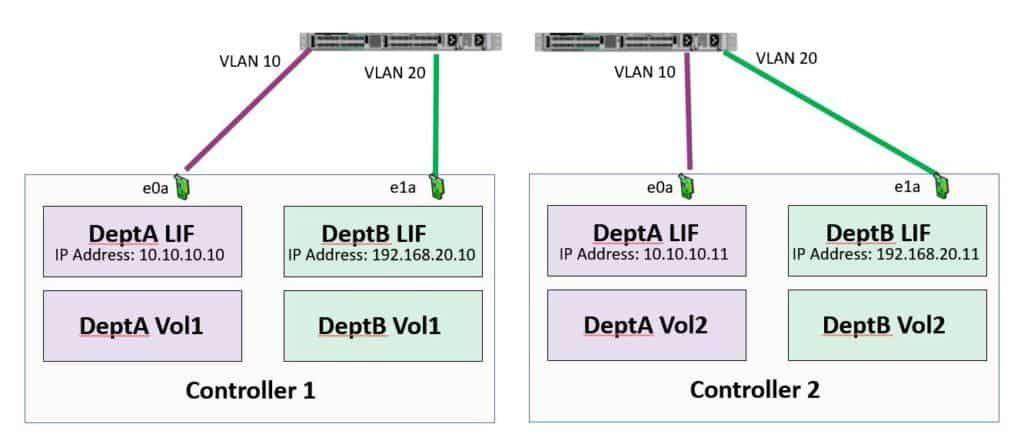 We do the same thing for DeptB. They've got a LIF with IP address 192.168.20.10 on node 1, and a LIF with address 192.168.20.11 on node 2. Again, we're going to balance the incoming client connections across all the available nodes.