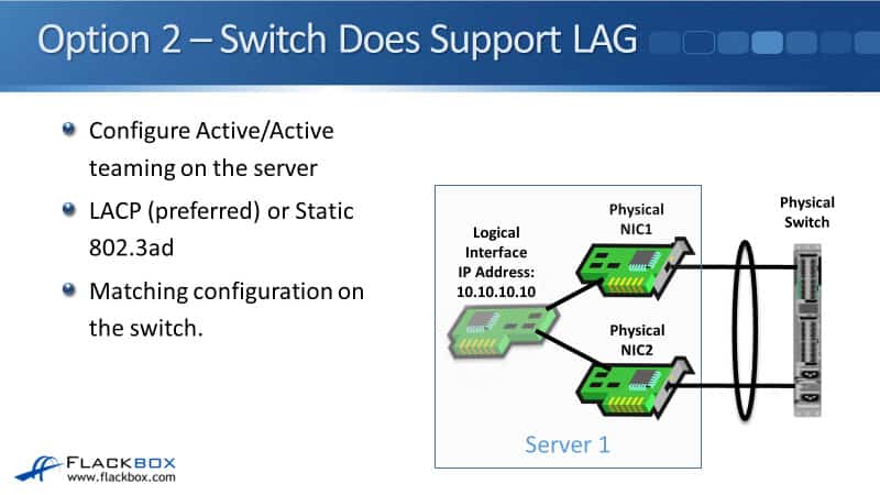 Our next option, option two, the switch does support link aggregation. In that case, we can configure Active/Active teaming on the server, and we do a matching configuration on the switch as well. If both the server and the switch support it, it’s preferred to use LACP.