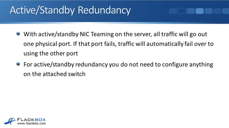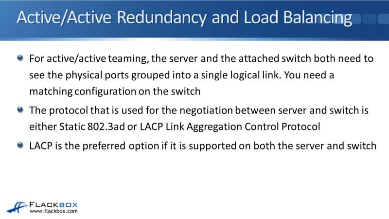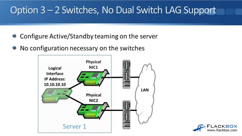 So you need to configure the server, and you need to configure the switches plugged into with a matching configuration, so they both know that you’re using NIC teaming on that server. You don’t need to do that with Active/Standby.