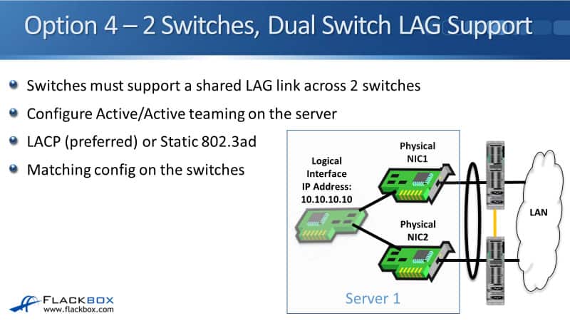 With option three, we’ve got two switches here, but there’s no dual switch link aggregation support. So most modern switches, even if they’re not expensive switches, will support link aggregation when the server has got two ports plugged into the same switch.