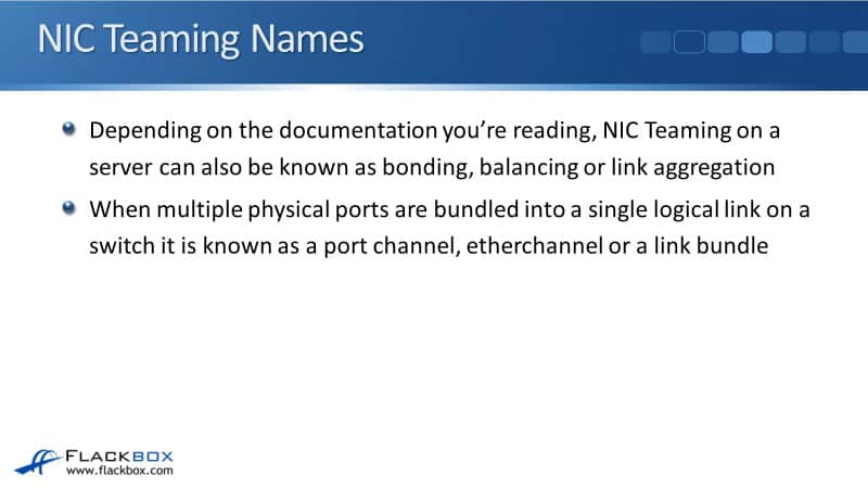 Depending on the documentation that you’re reading, there are many different names for NIC teaming. It can also be known as bonding, balancing, or link aggregation. Those are just different terms that all mean the same thing. So those are names when we’re talking about it on a server.