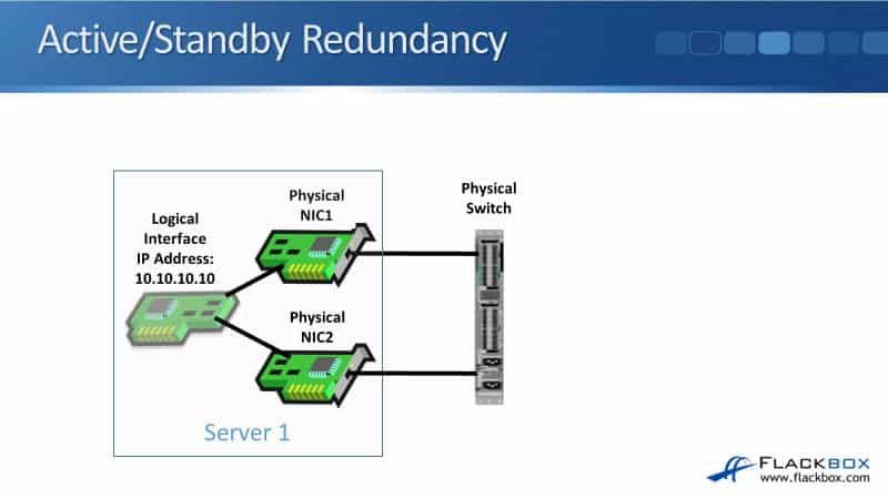 So, we do Active/Standby teaming on the server. When we configure the server, we go into the software there. We say we’re configuring NIC teaming, and we specify it’s going to be Active/Standby. On the switch that it’s plugged into, we just configure the switch ports.