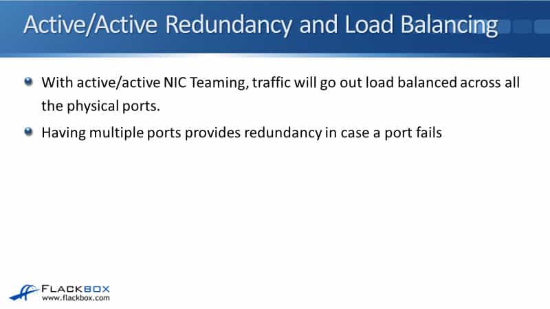 With Active/Active NIC teaming, traffic will go out load balanced across all physical ports, and you get redundancy as well. If one of the ports fails, then all the traffic will go out of the remaining port. So with Active/Standby, you’re only using one port when you’ve got two physical ports there.