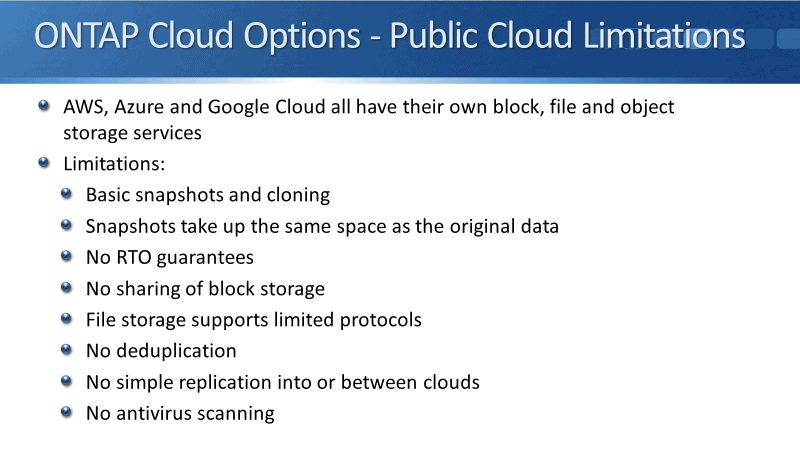 These limitations of the public cloud providers can be done by ONTAP. That's why you would want to use ONTAP rather than the cloud providers or native storage options.