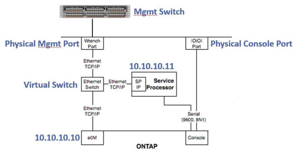 The e0m port, which is your normal management port, is connected to that virtual switch. The Service Processor is also connected to the virtual switch. The Service Processor is its own entity, separate from ONTAP.