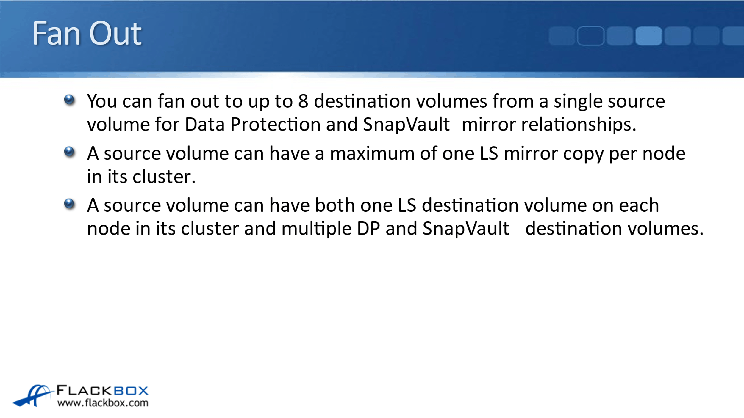 You can fan out to up to eight destination volumes from a single source volume for data protection on SnapVault mirror relationships. A source volume can have a maximum of one load sharing mirror copy per node in its cluster. You would never want to have more than one copy per node anyway, so that's really not a limitation.