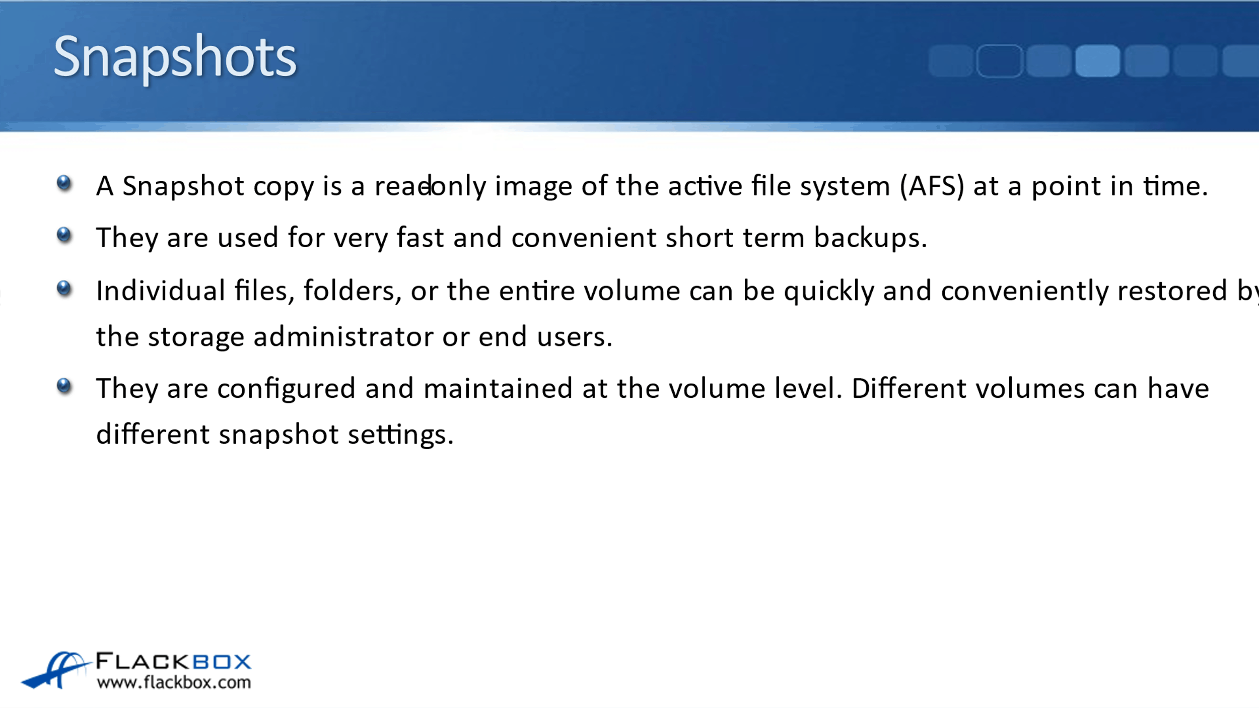 A Snapshot copy is a read-only, point in time image of the active file system (AFS). An active file system is whatever files and folders with a directory structure of a volume right now. You've got your volume, whatever files and folders are active in it right now, that is the active file system.