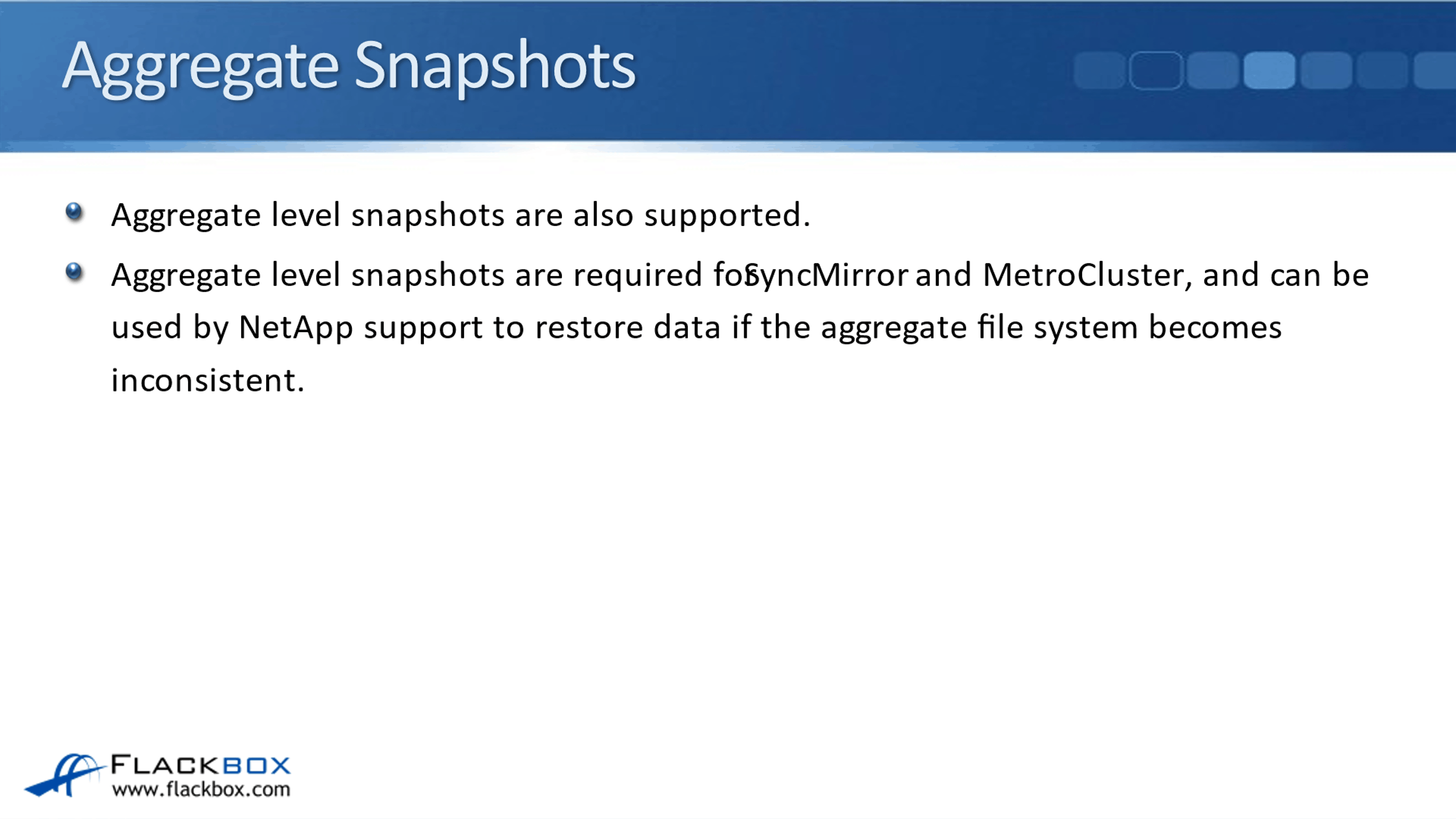 The aggregate level snapshots are there and supported, but when we're talking about snapshots in general, and when we're configuring and using them, it's going to be volume level snapshots.