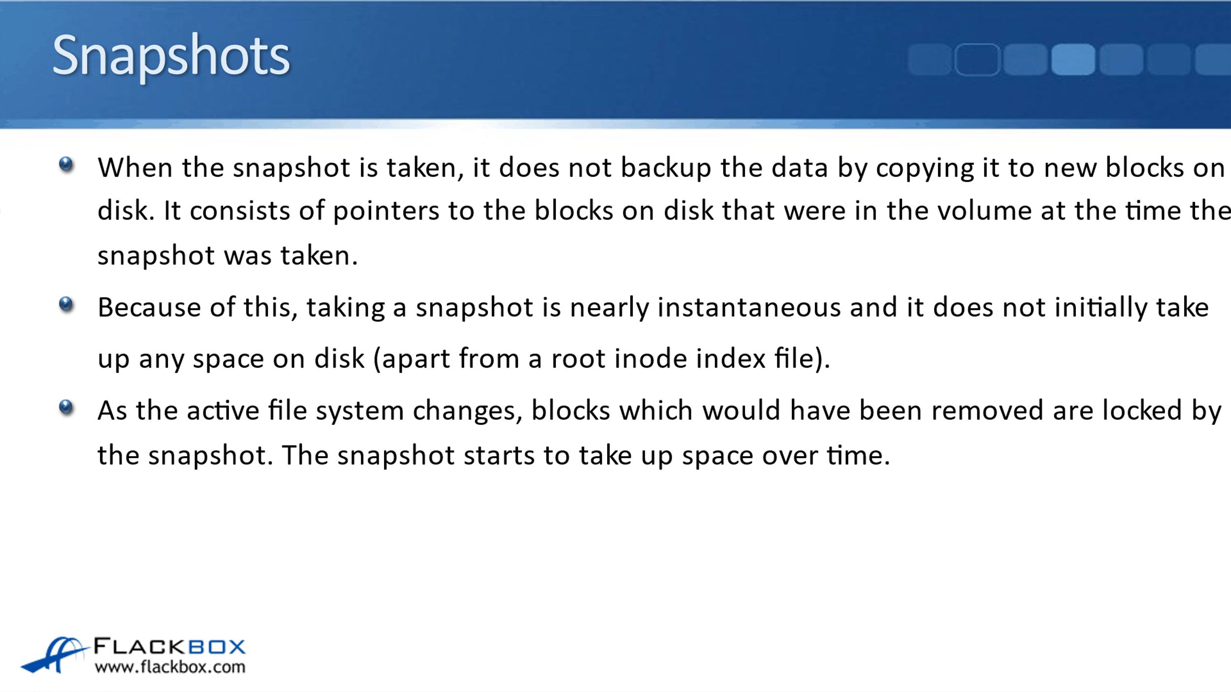 Because it's not copying data to new blocks on disk and just taking a pointer, the snapshot is nearly instantaneous. It's not taking time to actually copy it and move it into a new location, so it's nearly instantaneous. Also, it does not initially take up any space on disk, apart from a root inode index file.