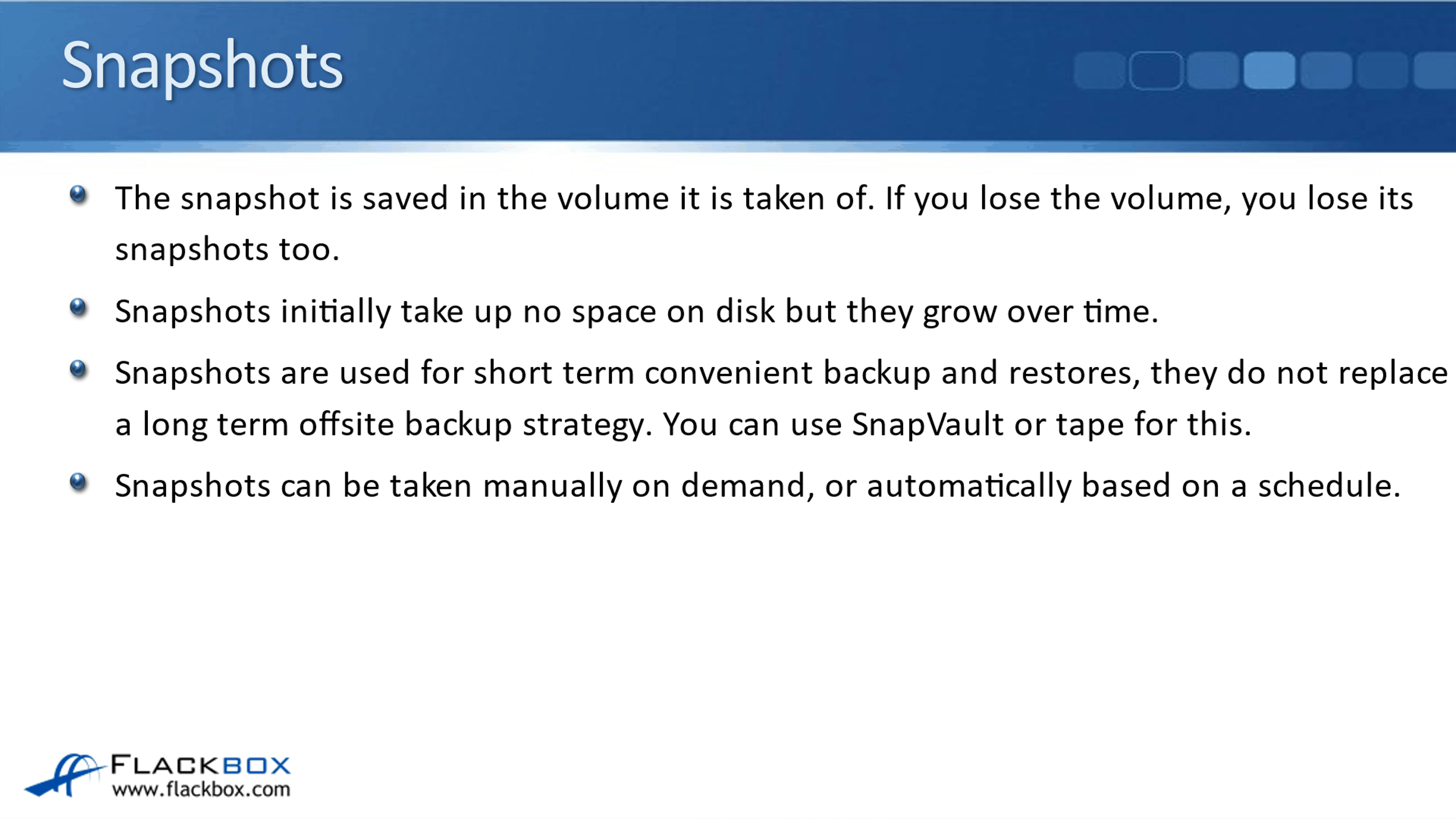 The snapshot is saved in the volume that it is taken off, so if you lose the volume, you lose the snapshots of the volume to. Snapshots initially take up no space, but they do grow over time, so because of those two characteristics of snapshots they're used for short term convenient backups and restores.