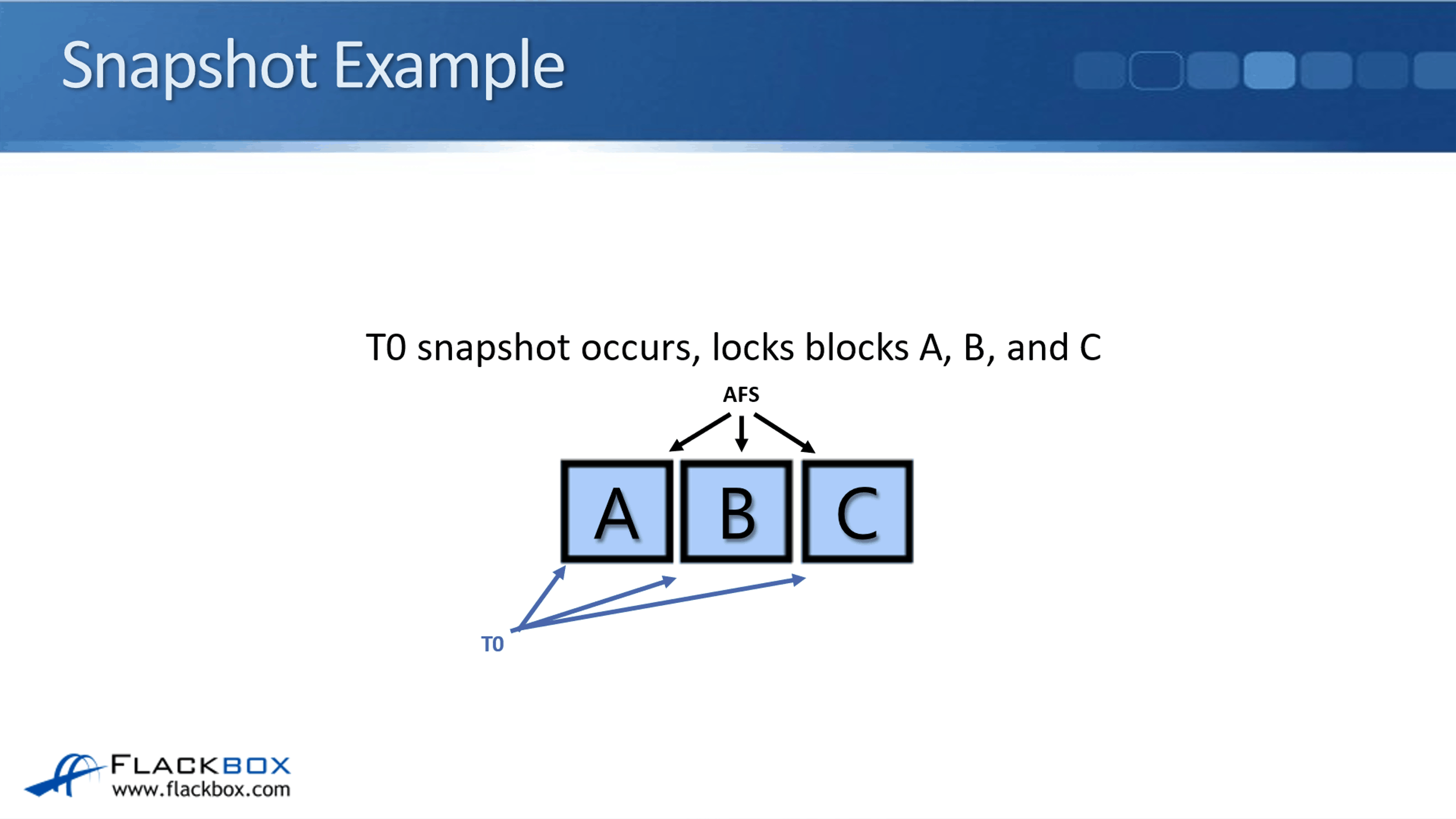 Now, we take a snapshot of the volume. That is our T0 snapshot. That locks blocks A, B, and C. The snapshot doesn't take up any space, it just consists of pointers of what was in the active file system at the exact time that the snapshot was taken. So, snapshot T0 has got pointers to blocks A, B, and C.