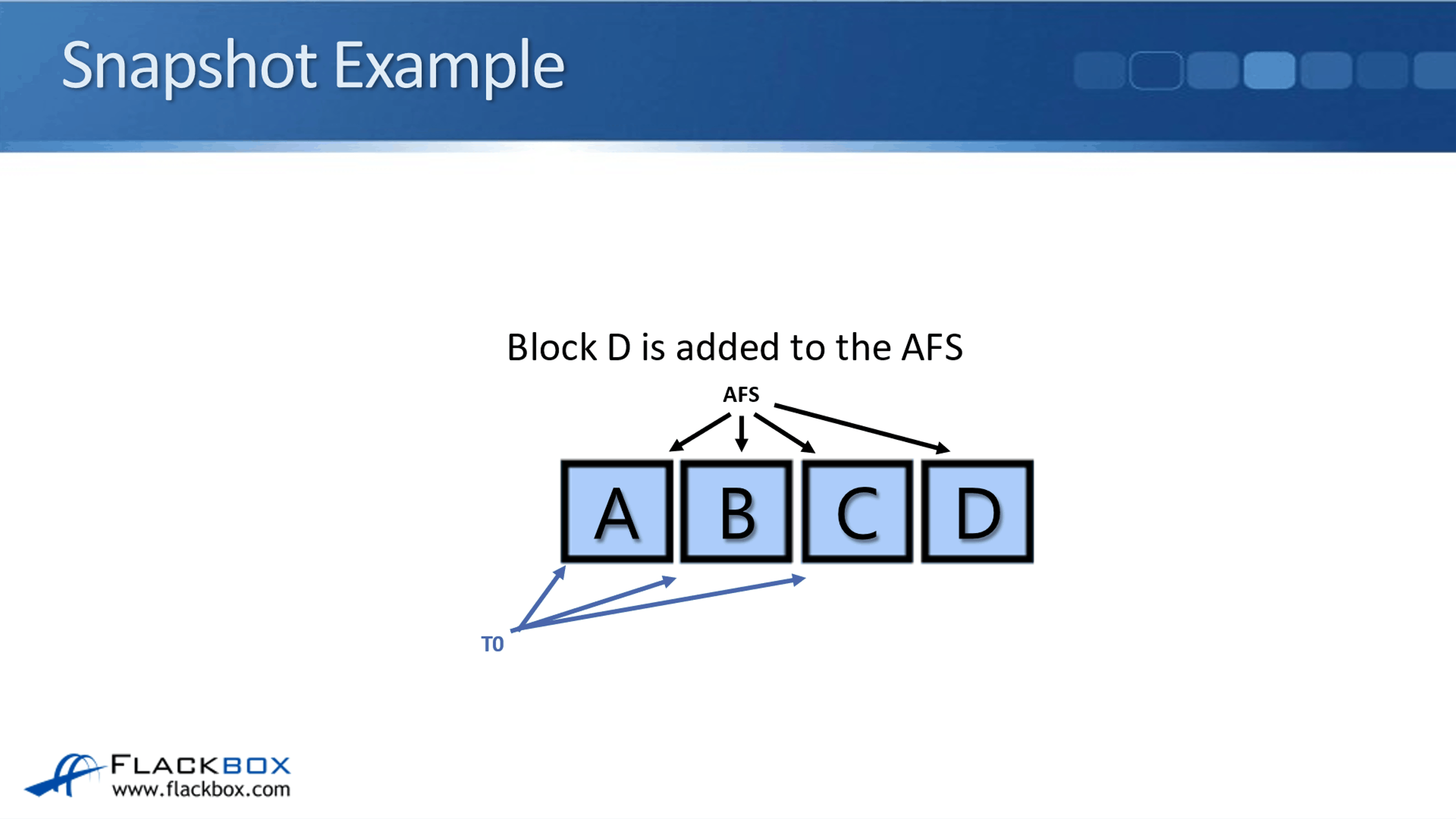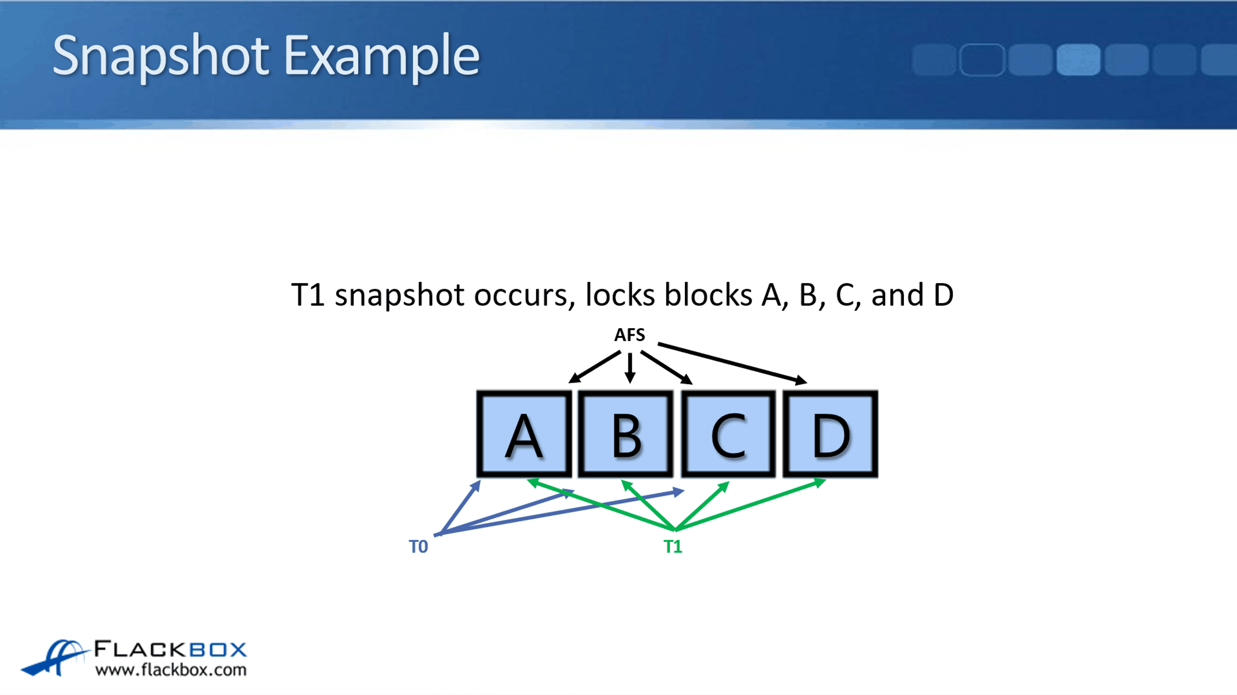Let's look and see where we are at right now. The point in time that we stopped with the example, block A is locked by the T0 and the T1 snapshots. It's no longer in the active file system.