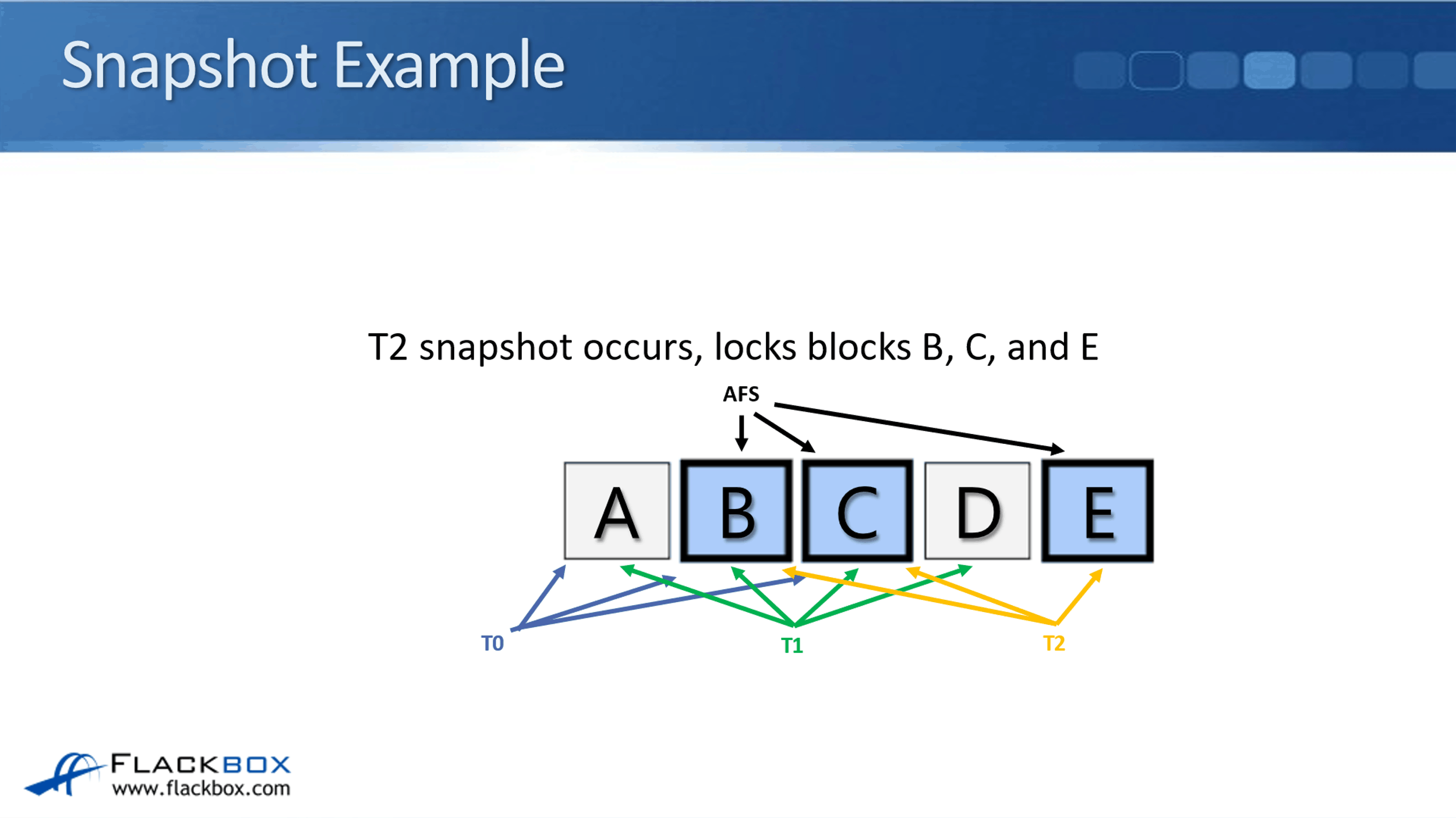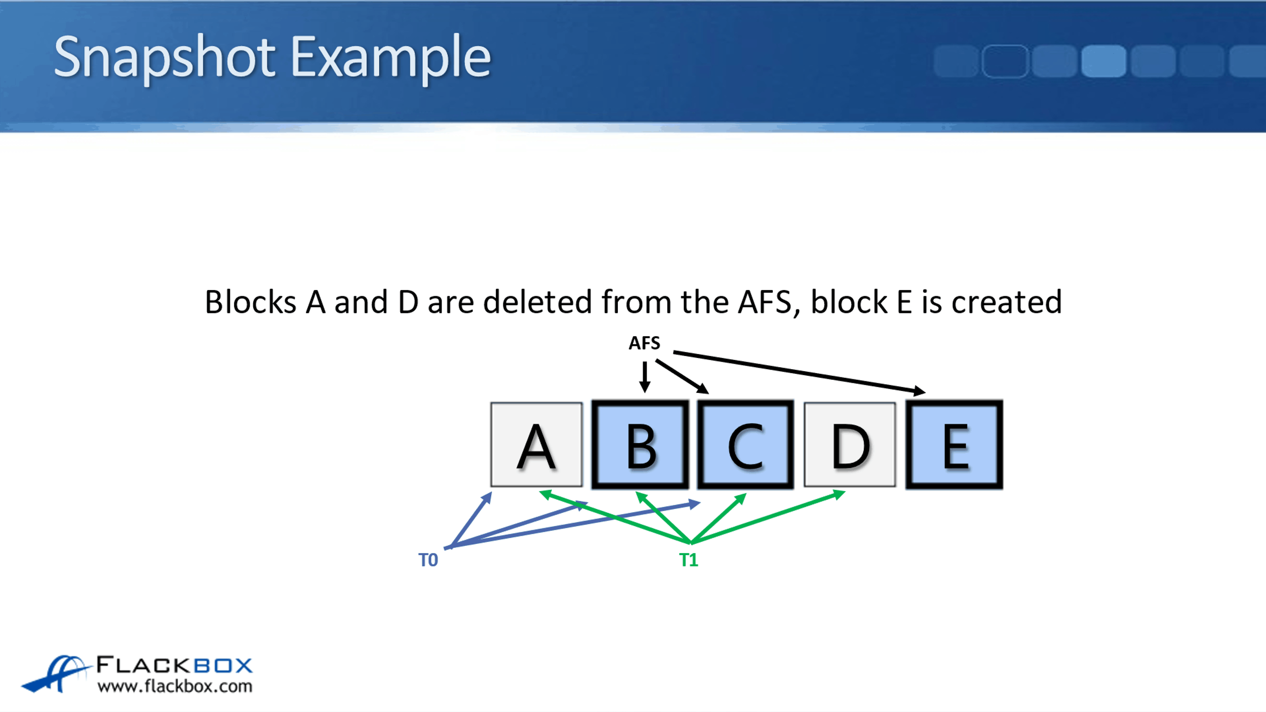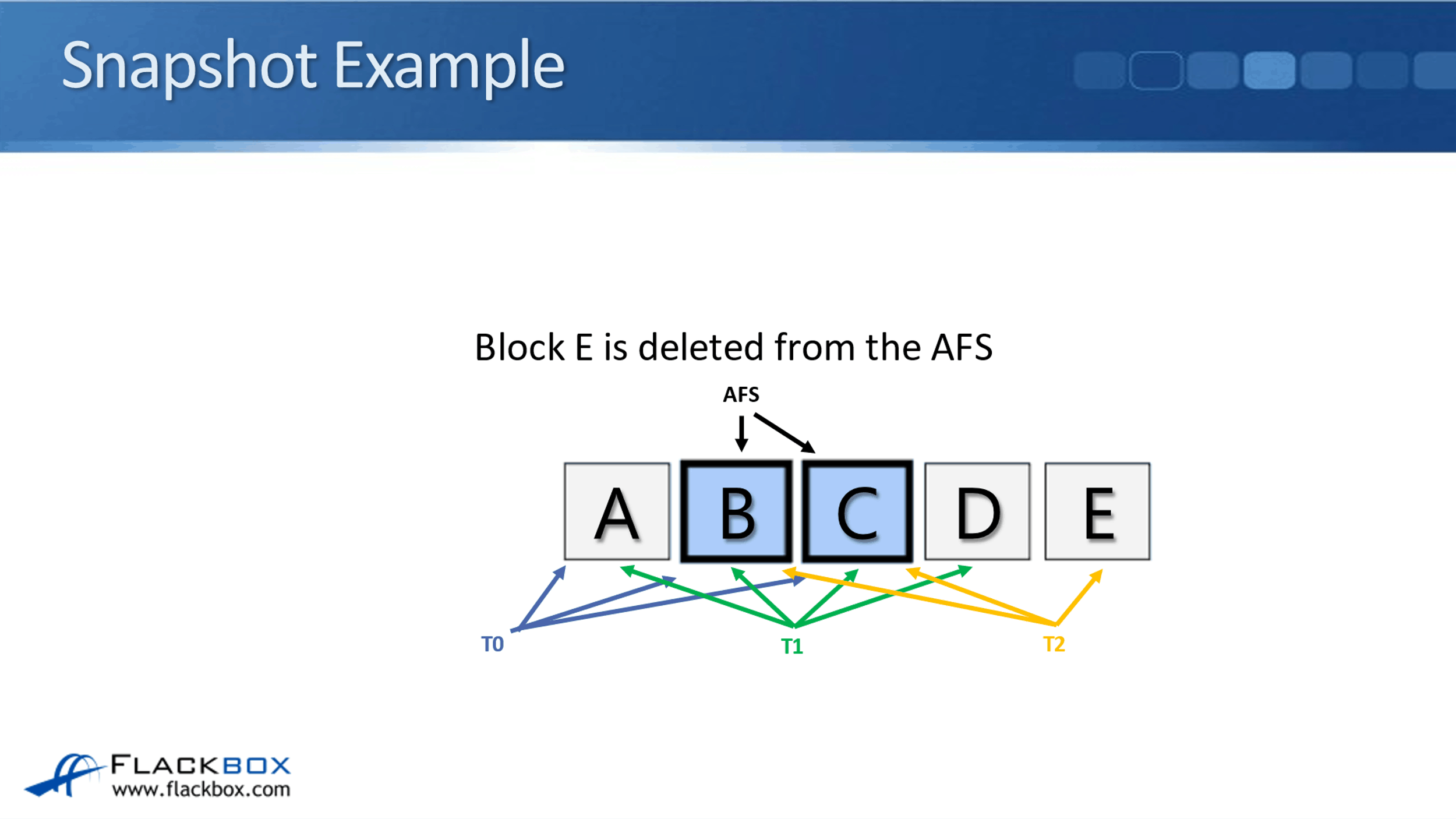 You can see that right now, the file system consists of blocks B, C and E. The snapshots never change, so T0 is always going to contain pointers to blocks A, B and C, and the T1 snapshot is always going to contain pointers to blocks A, B, C and D.