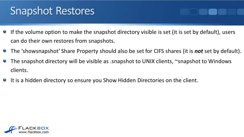 Now when the snapshot directory is visible, it will show up as a directory inside the volume, and to Unix clients, it will show it as a directory named .snapshot. To Windows clients, it will show up as ~snapshot. The snapshot directory is a hidden directory, so you need to ensure that you show hidden directories on the client for them to be able to see it.