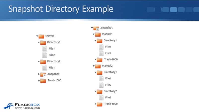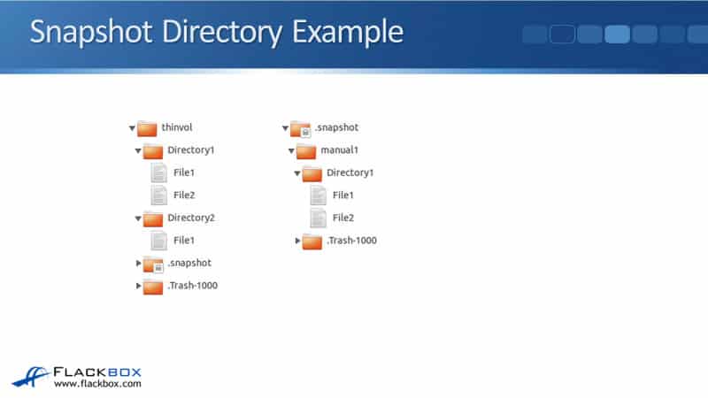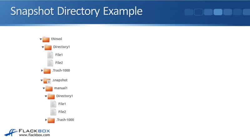 The next thing that happens is the user creates a new directory called Directory2 and puts a new file in there called File1. If they then expand the snapshot directory, they will see the manual snapshot that was taken by the administrator, named manual1.