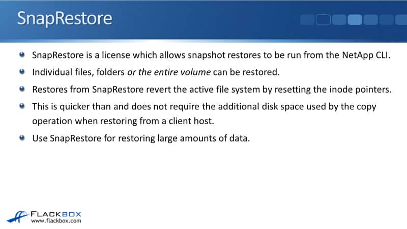 When you do a restore from a client, it uses a copy. When you use SnapRestore at the command line, it resets the inode pointers, and it's much faster doing it from the command line. Because of that, use SnapRestore for restoring large amounts of data, because it doesn't take that additional disk space with the copy and it's much faster as well.