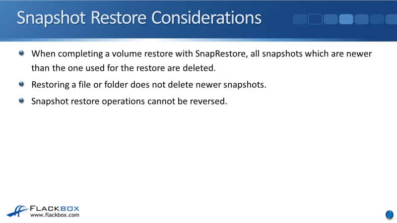 Some final considerations about snapshot restore operations when completing a volume restore with SnapRestore, all snapshots which are newer than the one used for the restore are deleted. So be careful, and make sure you're restoring from the correct snapshot.