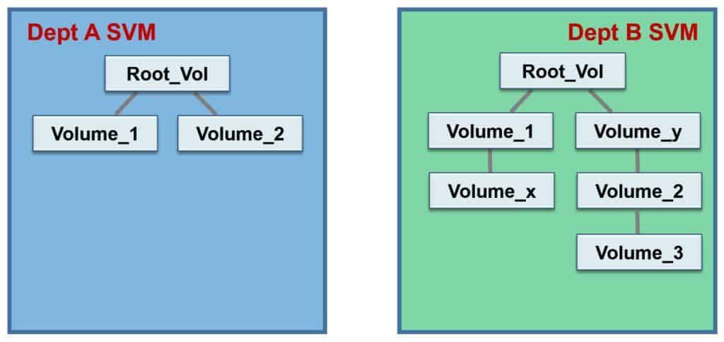 In the example here we've got the Department A SVM on the left. It's got its own volumes, QTrees, and LUNs. Whenever you create a volume, you have to specify the SVM that it's going to be for. Department B has also got its volumes, QTrees, and LUNs.