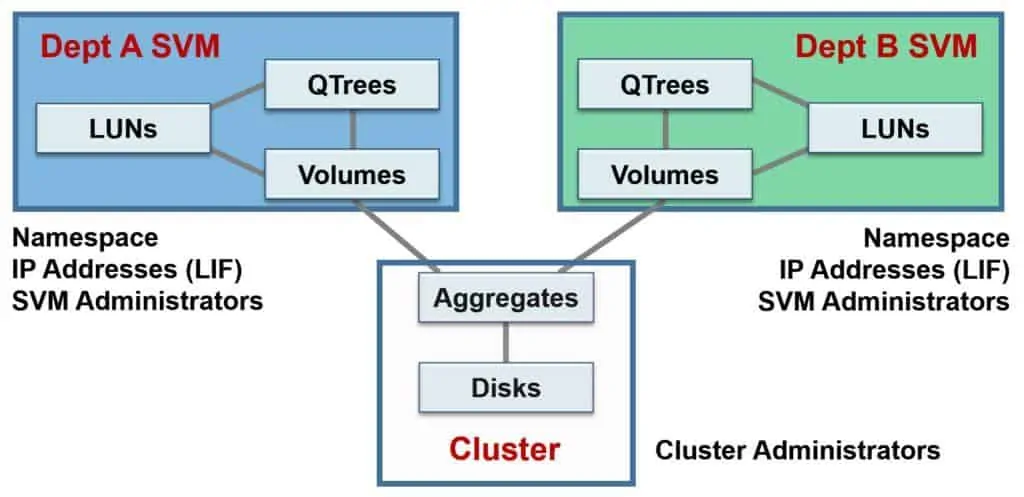 Looking at the architecture of our Data SVMs in the diagram below, we've got our physical resources (disks) at the cluster level. The disks are then grouped into aggregates. They can be shared between different SVMs.
