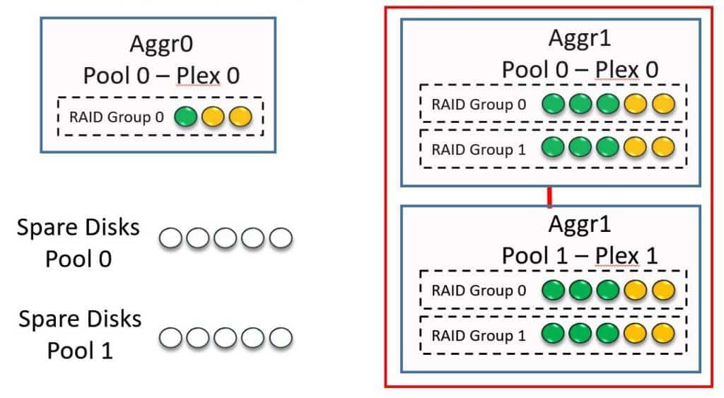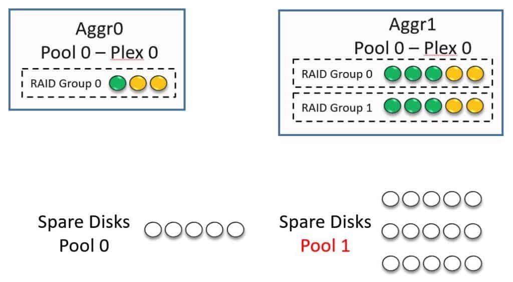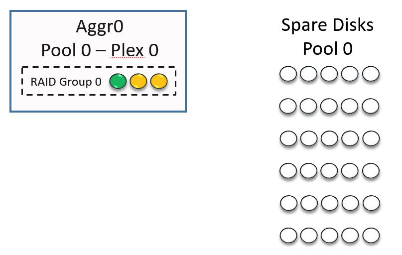 The diagram below shows a new system with all of the default settings. All of the disks are in Pool 0. We need to have an Aggregate0 for our system information, which is how it comes configured straight out of the factory. Aggregate0 is made up of three disks configured with RAID-DP.