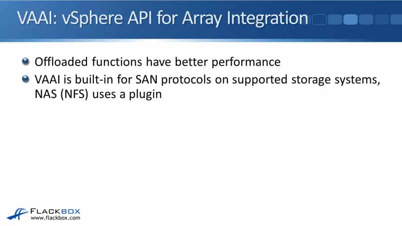 Starting off with VAAI, which is the vSphere API for Array Integration. This utilizes communication between the ESXi hosts and the storage system. vSphere can offload some functions to storage systems, such as virtual machine cloning.
