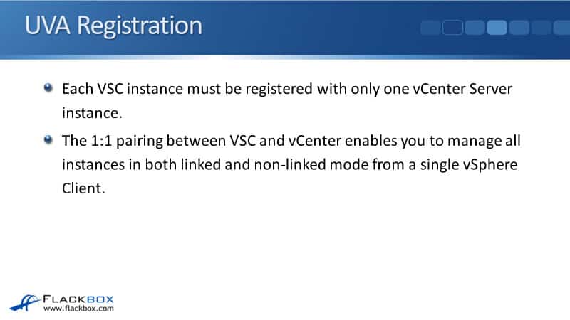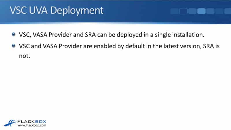 The UVA can be deployed with either a windows deployment of vCenter Server or the newer VMware vCenter Server Virtual Appliance, the vCSA, which runs its own Linux-based virtual machine. VSC, VASA Provider, and SRA can be deployed in a single installation.