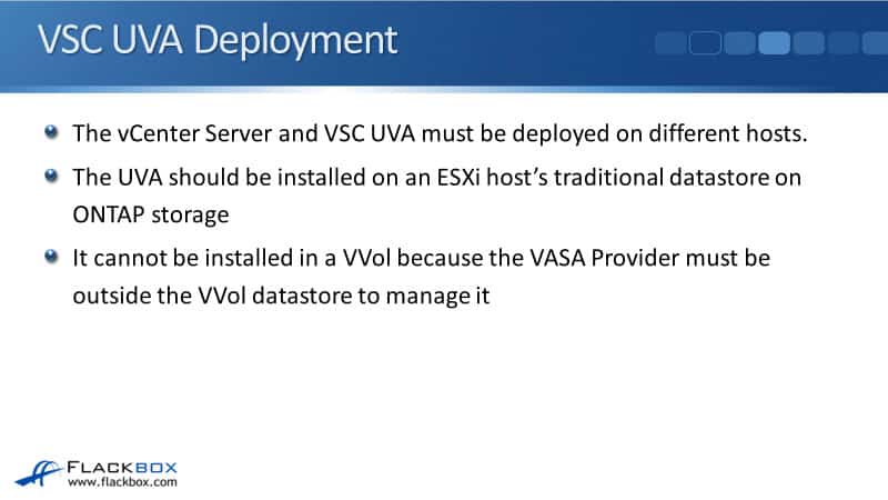The Unified Virtual Appliance (UVA) for Virtual Storage Console (VSC), the VASA Provider, and Storage Replication Adapter (SRA) is deployed as a virtual machine OVA in the vSphere environment. OVA files are used very commonly in VMware. What they are is a virtual machine with prepackaged settings.