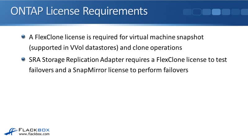 A FlexClone license is required for virtual machine snapshots, which are supported in VVol datastores and also clone operations. If you’re using Storage Replication Adapter (SRA), it requires a FlexClone license to test failovers and a SnapMirror license to perform failovers. You're only going to be using SRA if you are using VMware SRM.