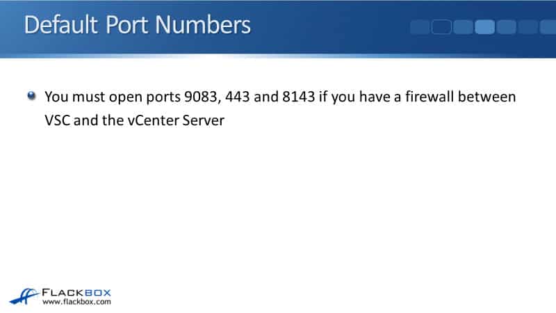 You must open ports 9083, 443, and 8143 if you have a firewall between VSC and the vCenter Server. Very often you won't, but if you do have a firewall, make sure you've got those ports open.