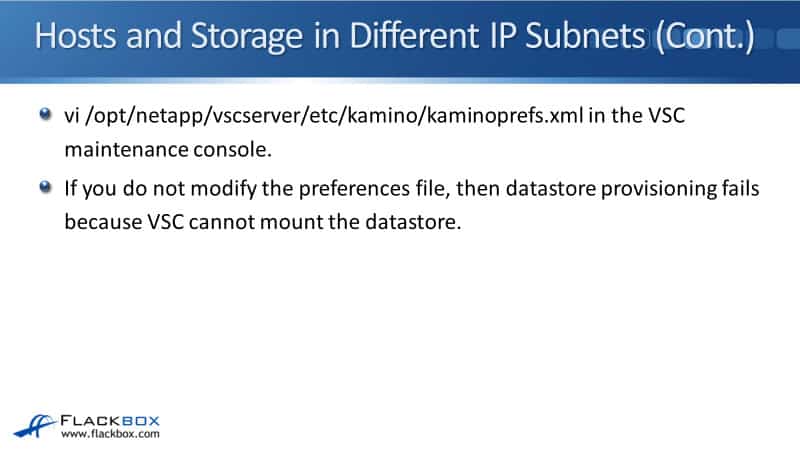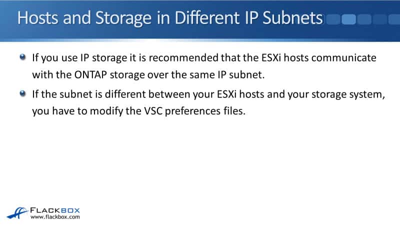 If the host and storage are in different IP subnets, which it shouldn't be, if you use IP storage, iSCSI, or NFS, it's recommended that the ESXi hosts communicate with the ONTAP storage over the same IP subnet.